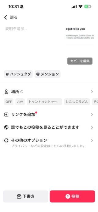 下書きをカメラロールに残すためには、投稿画面で「動画のダウンロード」をオンにした状態で投稿する必要があります。ここがオフのままだと、投稿自体は完了しても、端末には一切保存されません。