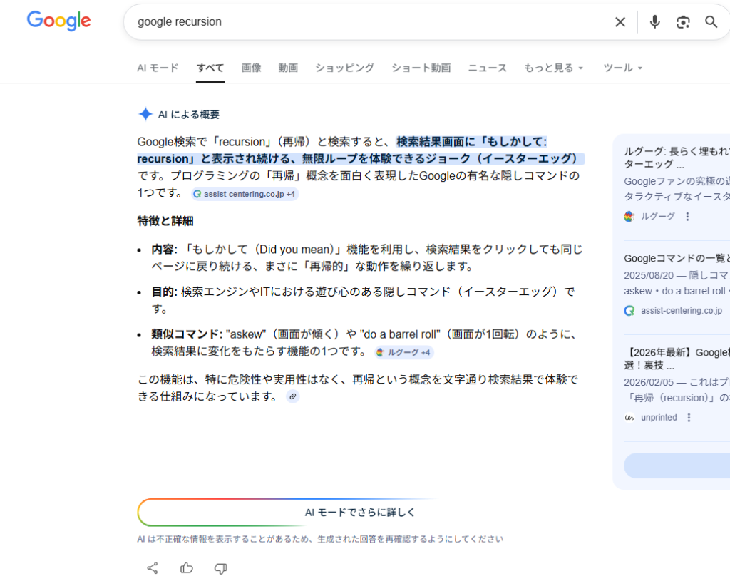 「もしかして: recursion」を何度もクリックし続けると、ブラウザが徐々に重くなるケースがあります。これは不具合ではなく、単純に描画処理や履歴の積み重ねによる負荷です。