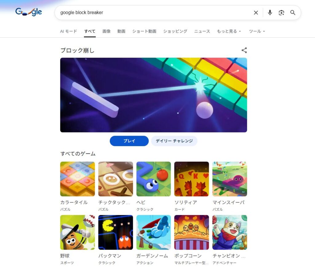 それに対してGoogle Block Breakerは、検索機能に溶け込むことを目的としているため、意図的にシンプルな構成が保たれています。操作やルールを覚える負担が少なく、初見でも直感的に理解できる点が特徴です。