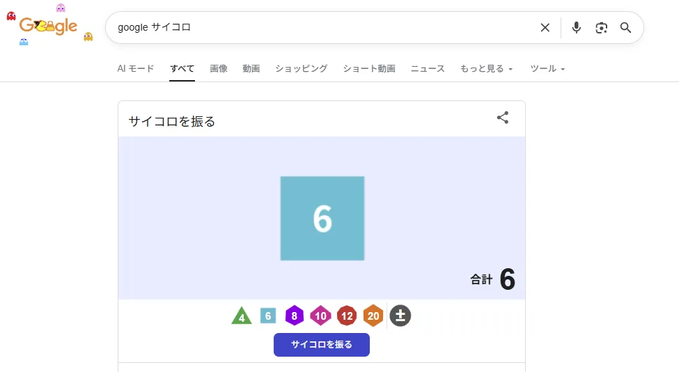 - Google検索バーに「Google サイコロ」または「サイコロを振る」と入力する