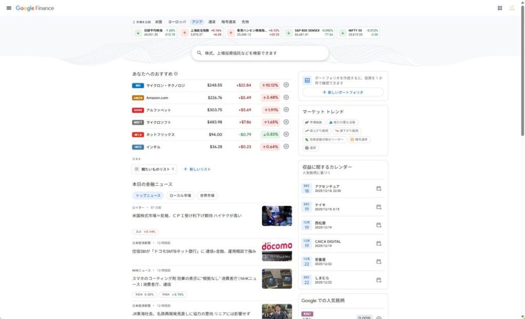 GoogleFinanceは、特に米国市場や海外市場の情報取得に向いています。世界的に利用者が多いサービスのため、海外企業やグローバル指数の情報が充実しています。