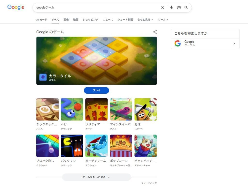 googleゲームの最大の特徴は、検索キーワードを入力するだけでゲーム画面が検索結果内に表示される点です。特定のゲーム名を検索すると、検索結果の上部や中央にゲームが埋め込まれ、そのまま操作を始められます。ページ遷移が少なく、操作も直感的なため、IT操作に不安がある方でも迷いにくい構造になっています。
