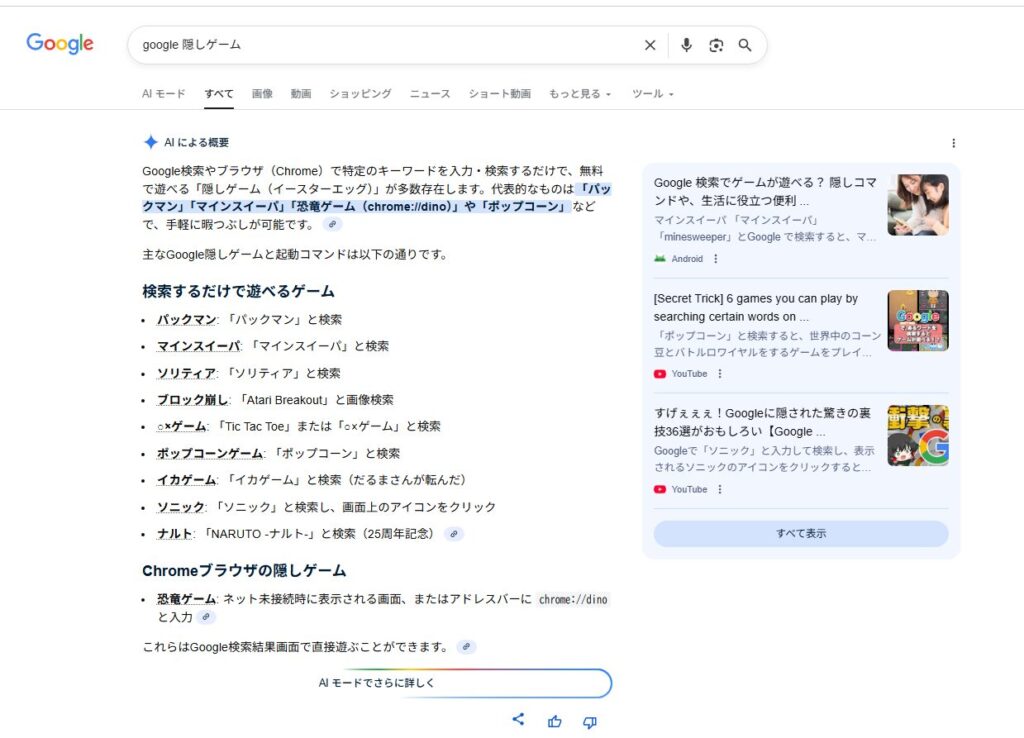 Google隠しゲームとは、Google検索やGoogle Chromeに公式に組み込まれているミニゲーム機能のことです。特定のキーワードを検索窓に入力したり、特定の状態になることで、自動的にゲーム画面が表示されます。一般的なゲームサイトとは異なり、Google自身が提供しているため、無料で安全に遊べる点が大きな特徴です。