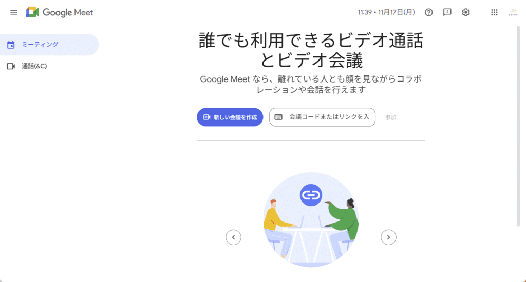 Googleアカウントへログインした状態で、ブラウザからGoogle Meetのトップページにアクセスします。アプリ不要で動作するため、準備の手間がかかりません。