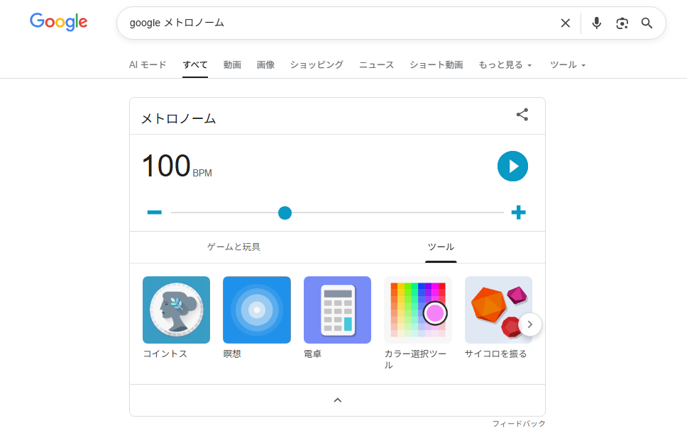 内部的には、Googleがあらかじめ用意している軽量なWebアプリが、検索結果の一部として読み込まれています。そのため、ページを移動することなく、再生や停止、BPMの調整といった操作が可能です。ITに詳しくない方でも「検索=操作開始」という非常に分かりやすい流れになっています。
