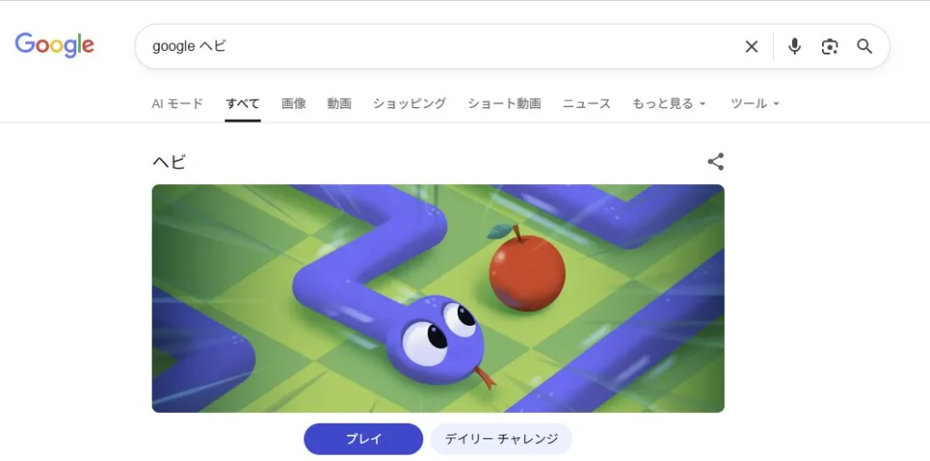 Googleヘビ(GoogleSnake)は、Google検索上で誰でも無料で遊べるブラウザミニゲームです。検索欄に「Googleヘビ」または「Google Snake」と入力するだけで、特別なアプリのインストールなしにすぐプレイできます。スマートフォン・パソコン・タブレットいずれのデバイスにも対応しており、操作も非常にシンプルです。矢印キーやスワイプで蛇を操作し、画面上に現れるりんごを食べるとスコアが上がり、ヘビが少しずつ長くなっていきます。