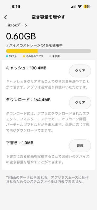 キャッシュ削除後、必要なデータは削除されませんが、注意しなければならない点もあります。例えば、動画の下書きや「いいね」をした動画、投稿済みの動画は消えませんが、これらのデータがアプリ内で一時的に保持されることはなくなるため、アプリ内で少し操作が変わる可能性もあります。誤って重要なデータが消えたわけではないので、安心してください。