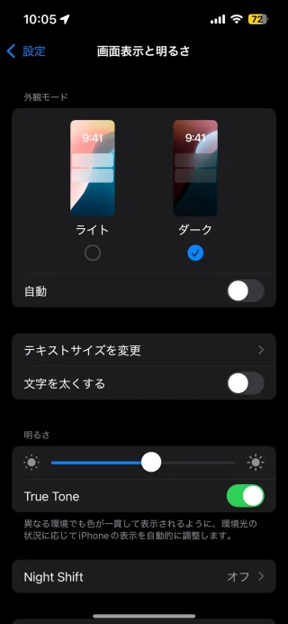 「自動」がオンになっていると、日中はライト、夜はダークに自動で切り替わるため、一定の見た目を維持したい場合はオフにしておくと良いです。