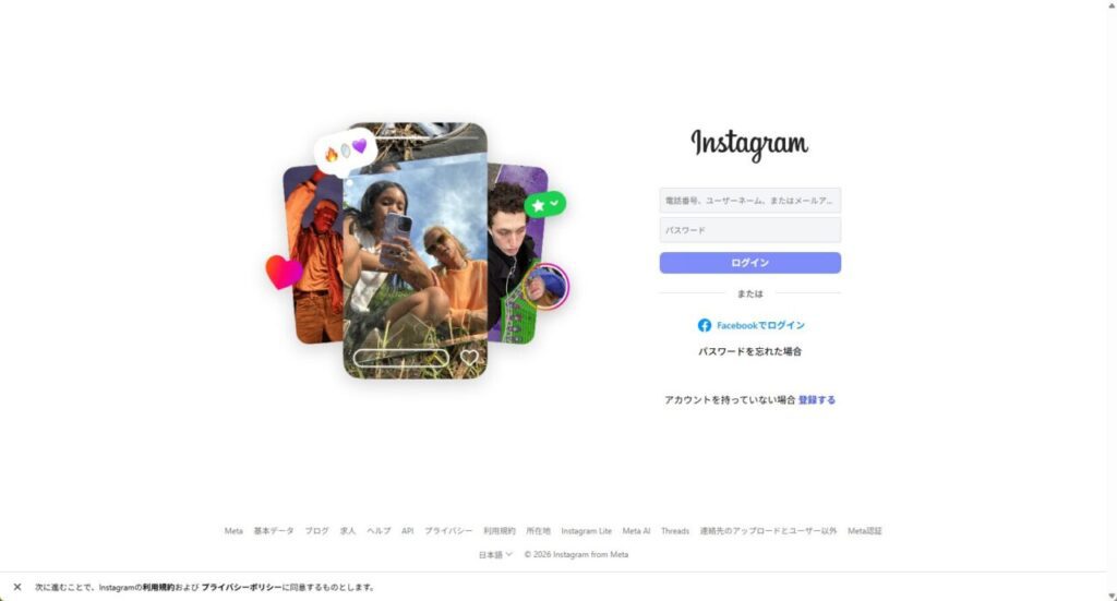 インスタ ブラウザ版とは、Instagramを専用アプリではなく、Webブラウザ上から利用できる公式の利用形態を指します。パソコンやスマートフォンのブラウザでInstagramの公式サイトにアクセスするだけで使えるため、アプリのインストールが不要という点が最大の特徴です。端末の空き容量を気にせず利用できることから、ITに詳しくない方や、アプリ管理に不安を感じている方でも扱いやすい仕組みになっています。