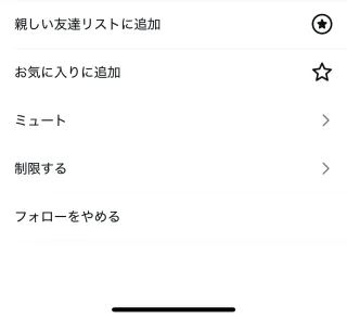 - 投稿をミュート:相手の投稿が自分のフィードに表示されなくなります。プロフィールを開けば投稿内容は確認可能です。