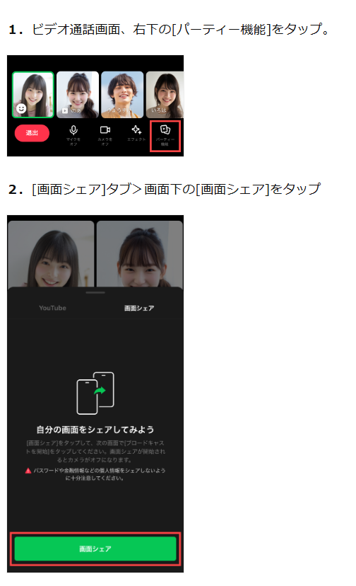 ビデオ通話中の画面下部に表示されるメニューから「パーティ機能」をタップします。すると「YouTube」や「画面シェア」といった選択肢が表示されるため、「画面シェア」を選択します。