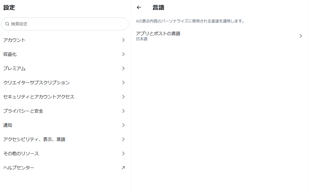 この場合、端末が日本語でも、ブラウザ版では英語表示になることがあります。PC版xでは「Settings and privacy」から個別に表示言語を変更できるため、アカウント側の設定が英語になっていないか確認するのがポイントです。